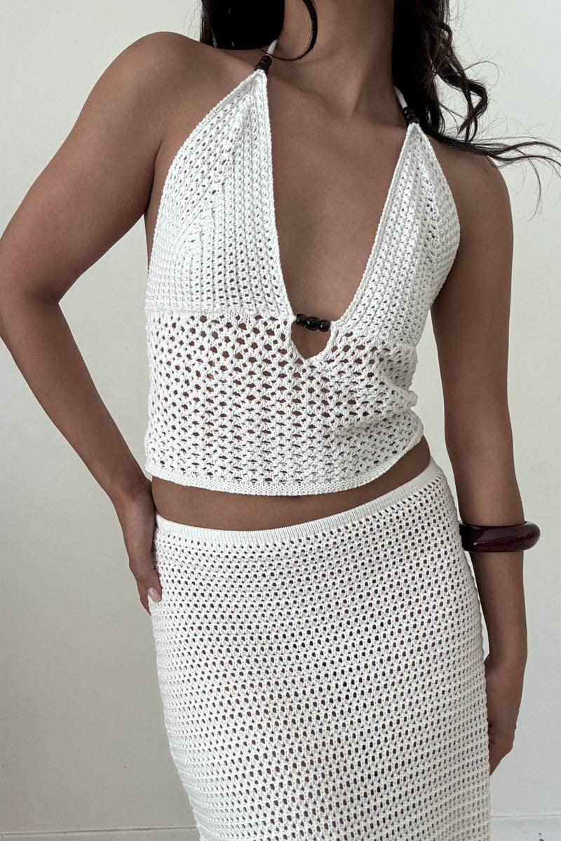 - Features: The halter neck design adds a touch of elegance, while the intricate crochet knit and beaded detailing provide a unique flair that sets this outfit apart.