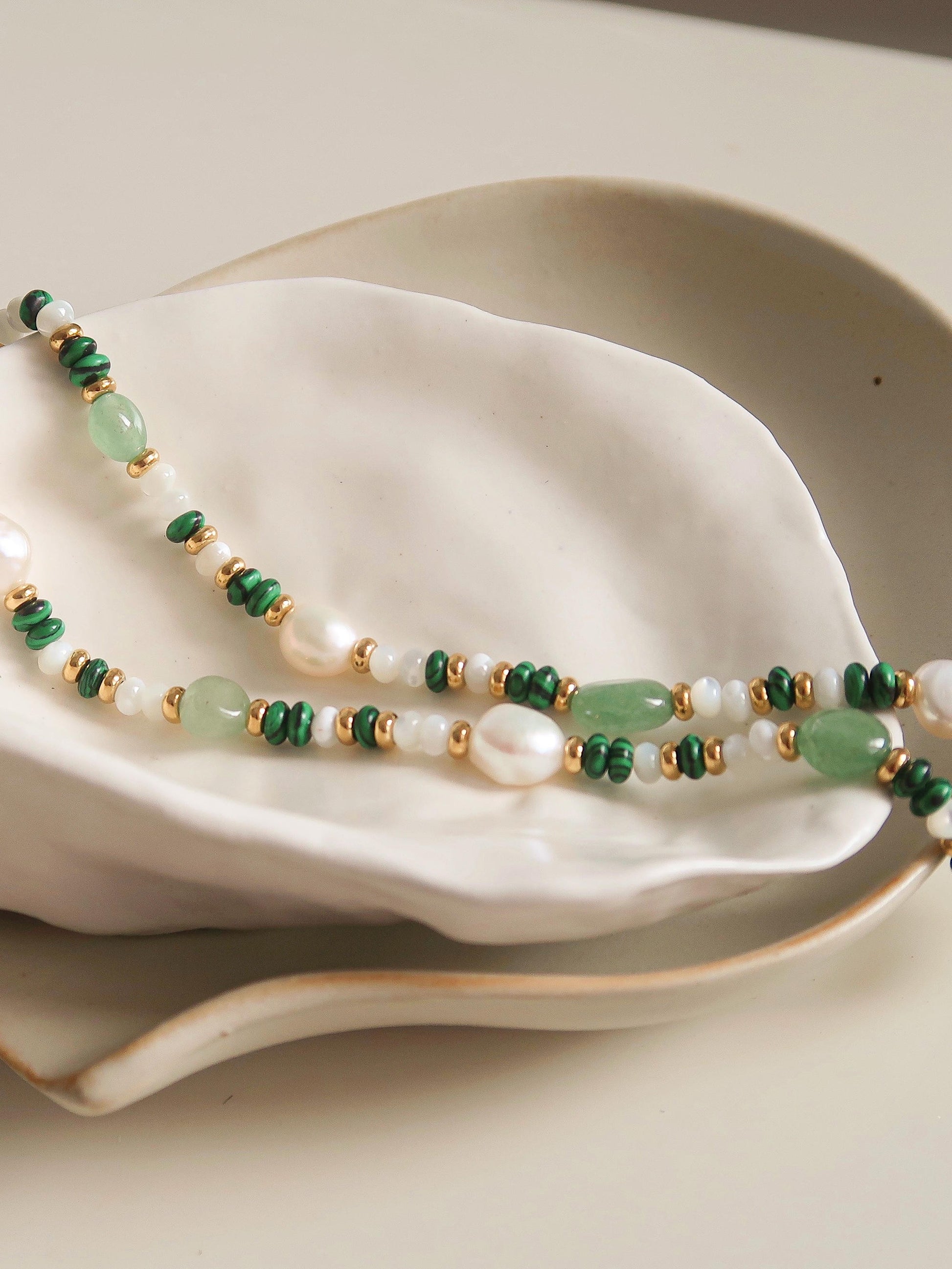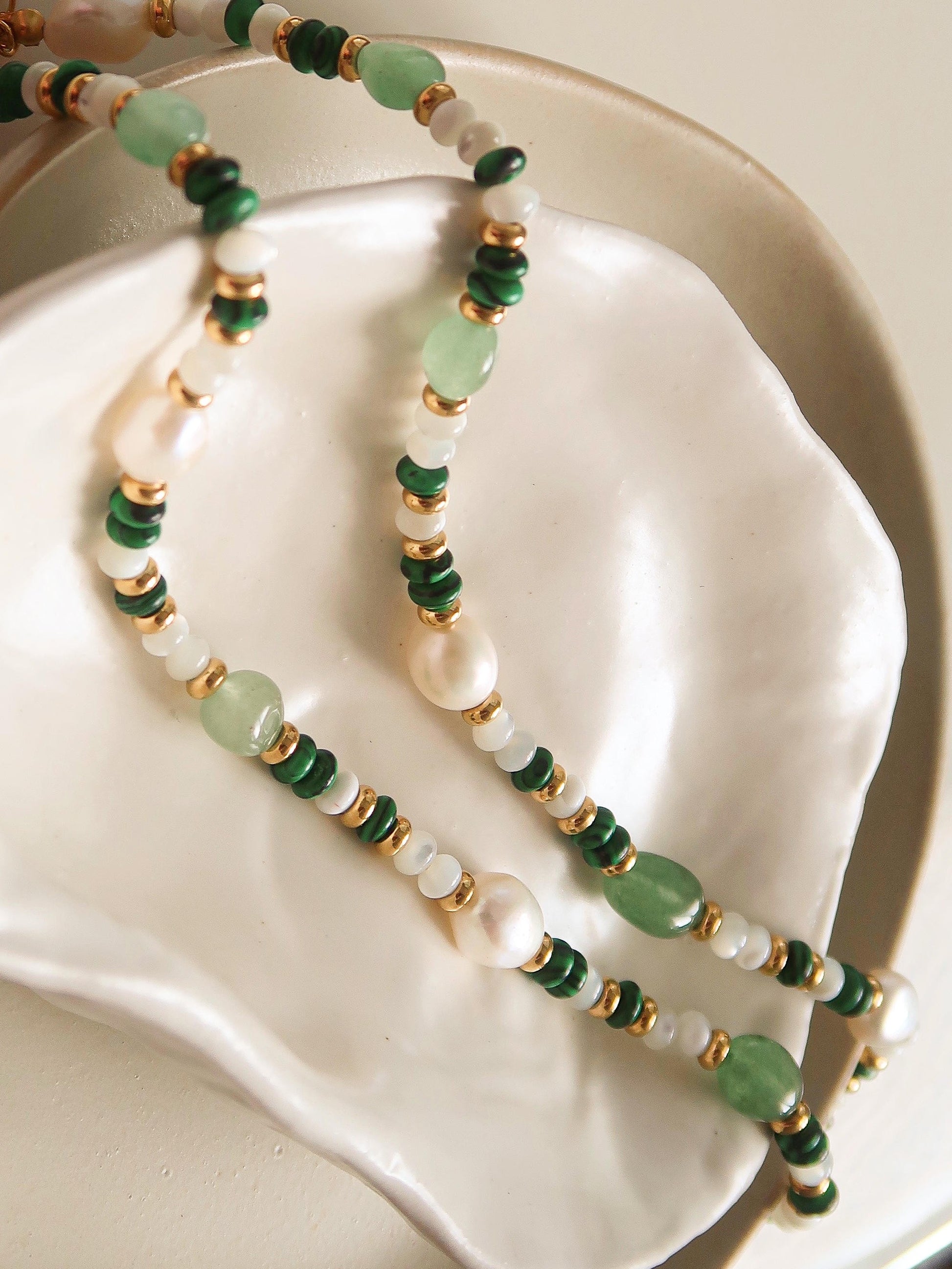 18K Bohemian Green Stone and Bead Necklace 18K Gold Plated Chain Handmade Natural Pearl CZ stones and beads Chain Length (inch): 15 Extension Length (inch): 2
